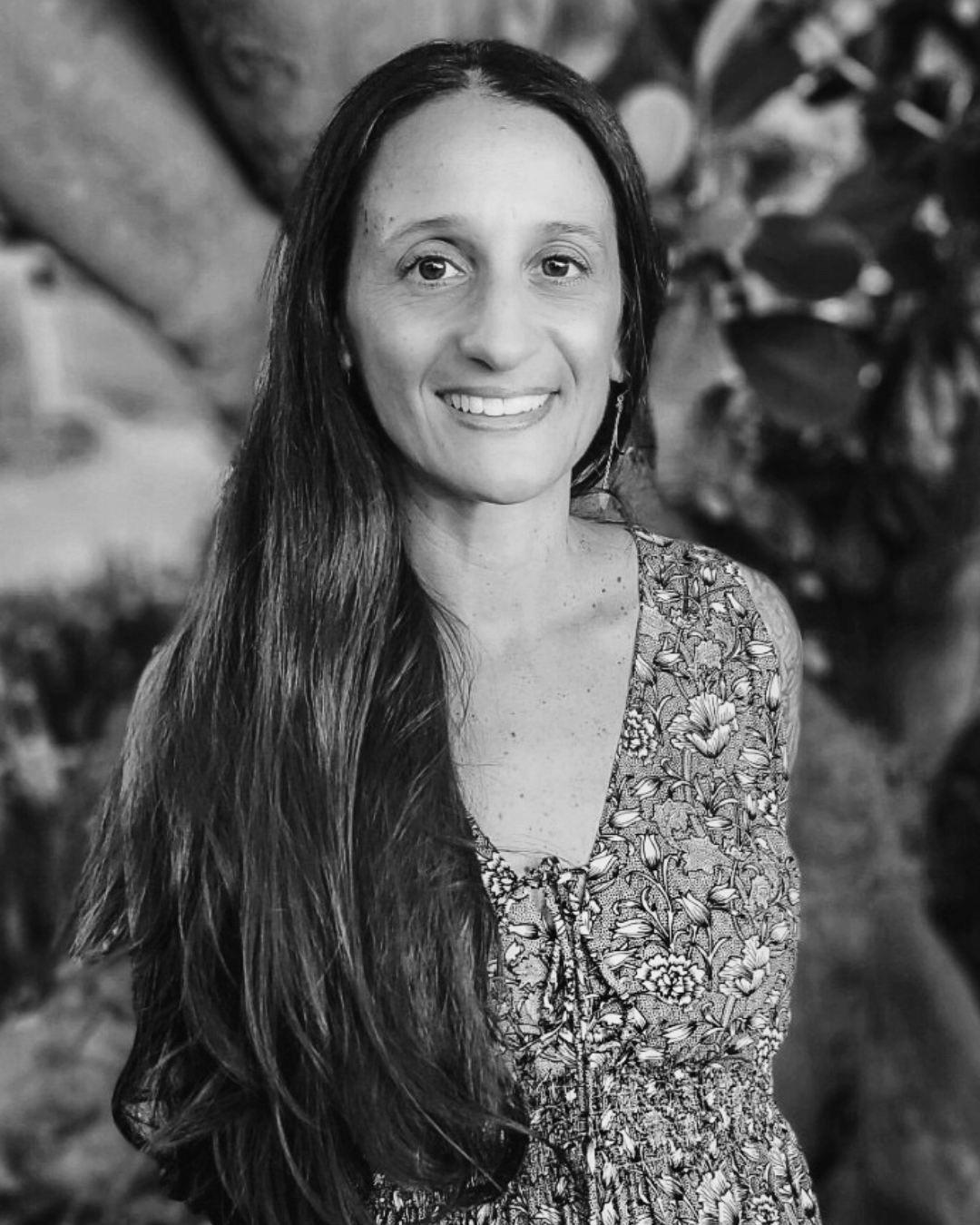 Black and white photo of a smiling woman with long, wavy hair, wearing a floral patterned top, standing outdoors with blurred foliage in the background.